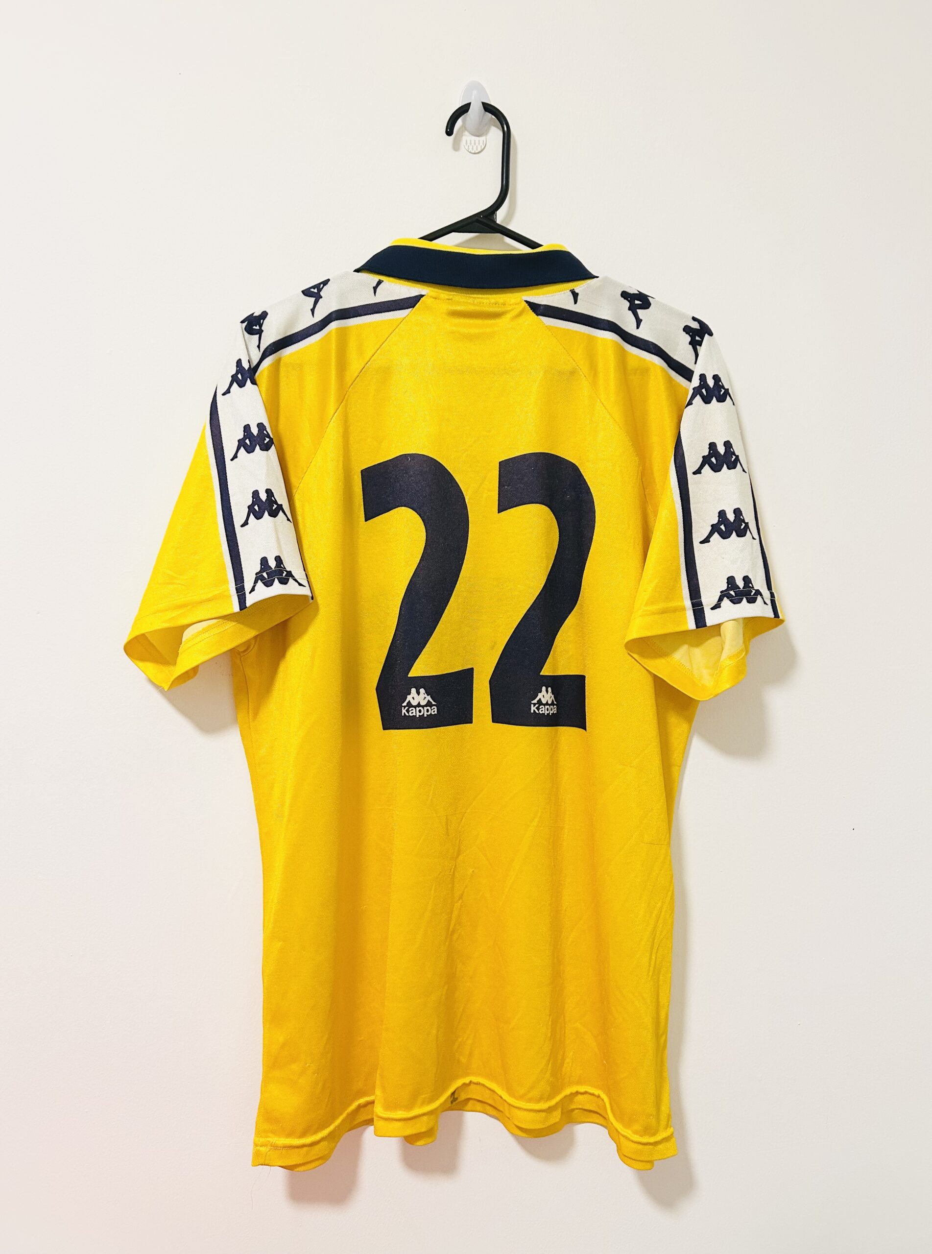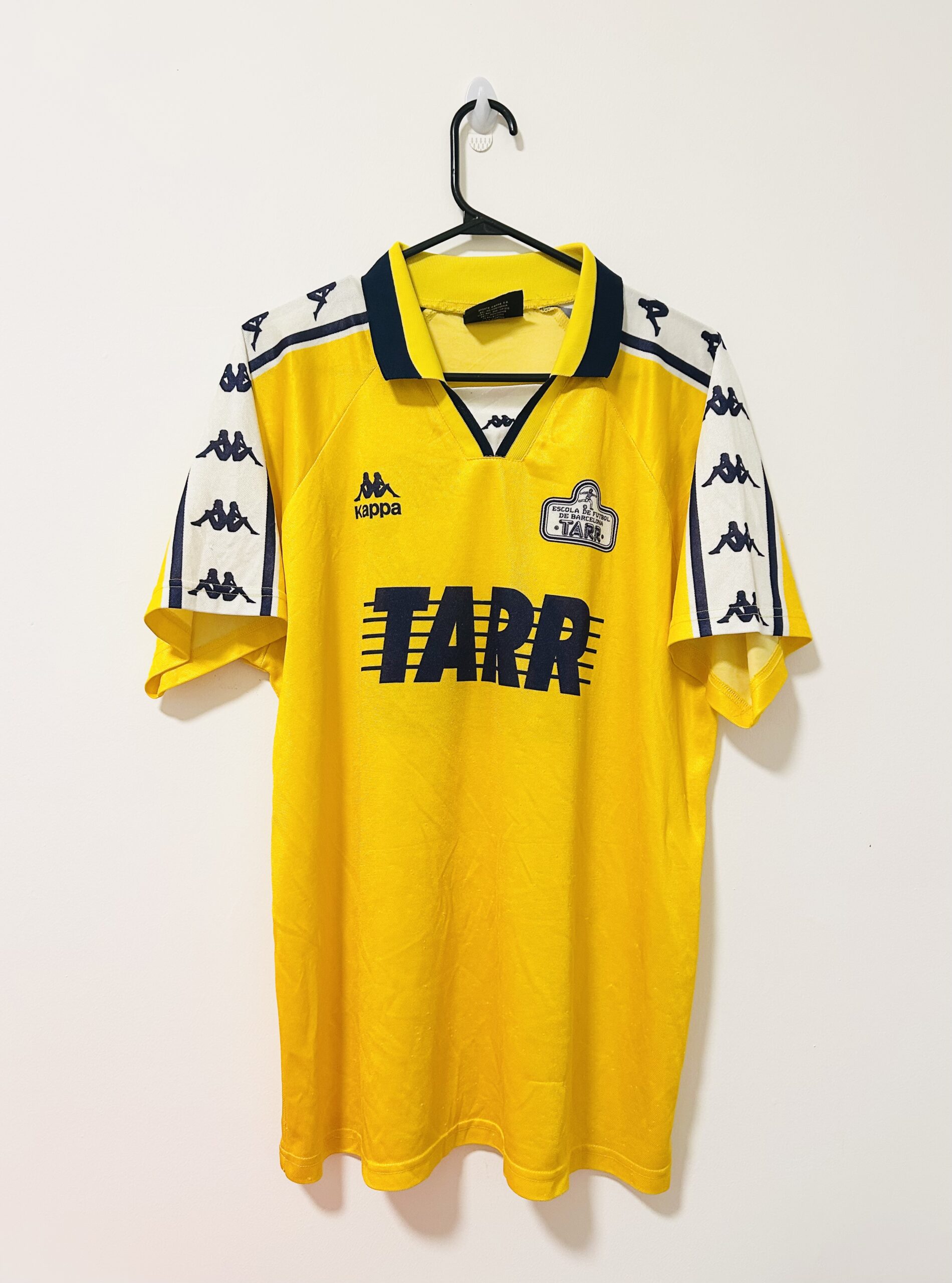 Match‑worn Escola de Futbol de Barcelona jersey from the 1995/97 period with number 22, reflecting the academy’s mid‑90s aesthetic with classic blaugrana tones, period‑accurate manufacturer marks, and durable polyester built for repeated youth fixtures. Typical player‑issue cues of the era include flock or felt numbering, reinforced seams at high‑stress zones, and a slightly roomier 90s athletic cut suitable for training layers and competitive play. As a rare academy garment tied to Barça’s youth pathway before the modern Barça Escola/Barça Academy branding, it offers strong provenance and historical appeal for advanced collectors. Recommended care and validation: confirm flat‑lay measurements, inspect wash‑wear, minor pilling, and number texture consistent with on‑pitch use; wash gently inside‑out and air dry to preserve fabric hand and prints.